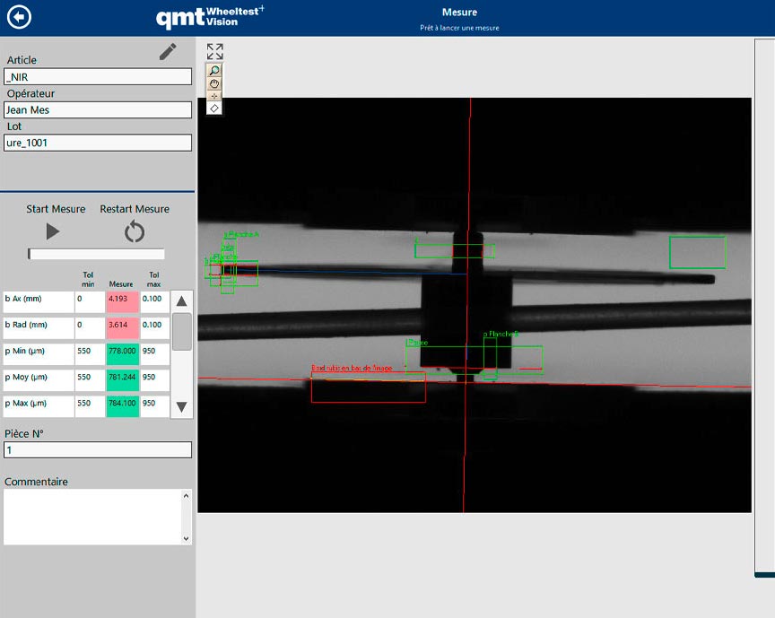 Während der Messung werden die Werte entsprechend dem Fortschritt sofort in der Grafik angezeigt. Nach mehreren Radzyklen (definierte Dauer) werden die Ergebnisse angezeigt und zeigen an, ob das gemessene Teil konform oder nicht konform (OK/KO) ist. Chargenverwaltung, Berichtsbearbeitung und die Schnittstelle zu Statistiksoftware ermöglichen eine optimale Einbindung der Geräte in einen Qualitätsprozess. Der QMTWheeltest-Vision kann dank des „Fit For You“-Programms auch personalisiert werden.