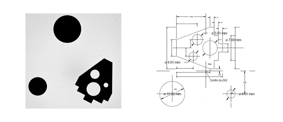 Pour valider cette méthode, des références mesurées par l’Institut fédéral de métrologie en Suisse, METAS, ont été utilisées. Une de ces références est illustrée ci-dessous. Des trois références utilisées, 9 diamètres intérieurs, 6 diamètres extérieurs et deux longueurs ont été mesurées :