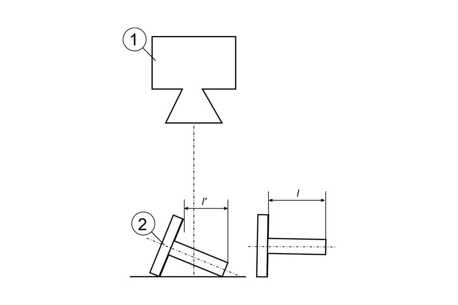 Le schéma ci-dessous décrit la difficulté : avec un système optique vertical, la longueur observée par le capteur (1, par exemple une caméra) est une longueur projetée (l’) qui peut être fausse si l’axe de révolution de la pièce (2) n’est pas parfaitement perpendiculaire à l’axe optique.