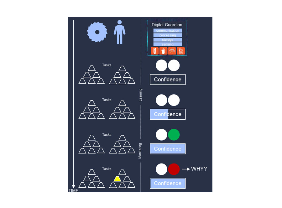 Digital Guardian ist ein autonomes und intelligentes Gerät, das sich sehr wiederholende Aufgaben beobachtet, die von einer Maschine oder einem Bediener ausgeführt werden. In einer ersten Phase lernt Digital Guardian aktiv den üblichen Zyklus der Aufgabe. Wenn es genug gelernt hat, kann es zur Überwachungsphase übergehen, in der Digital Guardian Anomalien erkennen und Informationen über den Sensor und das Signal, das den Alarm ausgelöst hat, bereitstellen kann. Digital Guardian befindet sich in der Entwicklung und wir sind offen für Partnerschaften, damit unsere ersten Kunden die Möglichkeiten nutzen können.