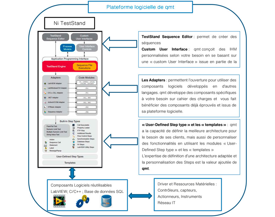 qmt has integrated TestStand into its software platform, allowing our customers to benefit from our 30 years of experience and capitalization. Our software platform integrates multiple already proven, robust and reusable components. This approach based on reuse and the definition of adapted architectures makes it possible to accelerate developments while delivering robust solutions.