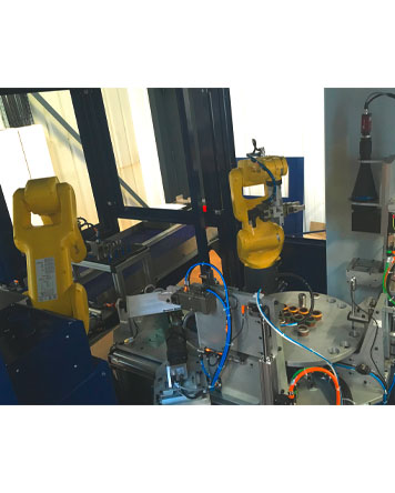 Ein erster Roboter lädt und entlädt die Teile und zwei andere Roboter handhaben die Teile auf verschiedenen Sätzen oder Steuerplattformen in der Zelle. Die 100% kontrollierten Teile werden direkt auf thermogeformten Schalen evakuiert. Diese technische Lösung ermöglicht Flexibilität, Steuerungsleistung und einen hohen Durchsatz.